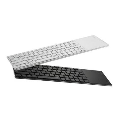 Rapoo E6700 bluetooth - новое детище компании, Bluetooth-клавиатура, которая соединила и дополнила все самое лучше из E6300 и E2700 в одном корпусе. Основа всей конструкции сделана из анодированного алюминия с четырьмя резиновыми ножками по углам, подложка клавиш пластиковая, впрочем как и сами клавиши, а поверхность тачпада стеклянная.