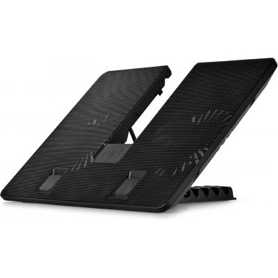 Размер - 390 х 280 х 27.5 мм, Совместимость - для ноутбуков с диагональю экрана до 15.6", Метод охлаждения - 2 вентилятора по 140 мм, 25 дБ, 1000 RPM, метал + пластик, Цвет - черный