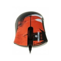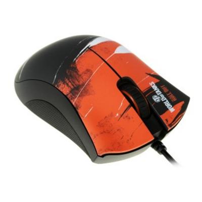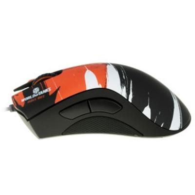 Мышь имеет подсветку яркого оранжевого цвета, колеса прокрутки и логотип World of Tanks.