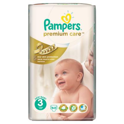 Пол ребенка - унисекс, вид - одноразовый, тип - подгузник, линейка - Premium Care, количество в упаковке - 60 шт, весовая группа - от 5 до 9 кг, размерная сетка - 3, размер упаковки - Эконом