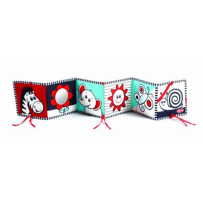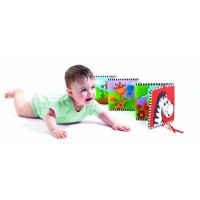 Благодаря плотным страничкам, книжку можно просто поставить в манежике или коляске.Одна сторона книжки-раскладушки — в чёрно-бело-красно-синих тонах, идеально подходящих для зрительного восприятия новорождённого.