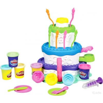 Комплектация набора: торт, экструдер, 6 свечей, нож, вилка, 2 тарелки и 5 баночек пластилина Play-Doh включая 2 баночки Play-Doh plus.