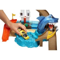 Трекимеетфантастический дизайн, доминирующим элементом которого выступает зубастая Акула, так и стремящаяся проглотить своей пастью машинку.Трек состоит из подъемника, который поднимает машинку на спуск, ведущий к пасти Акулы.