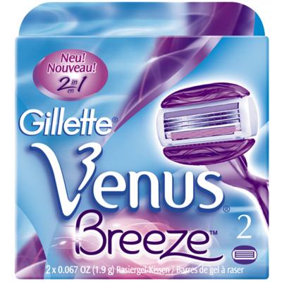 Сменные кассеты Venus Breeze c гелевой полоской 2 шт— подушечки геля для бритья, обогащенные натуральными маслами, со свежим тропическим запахом встроены в бритву.