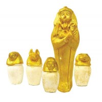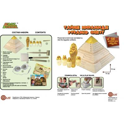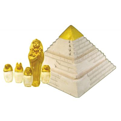 модель пирамиды, саркофаг, канопы (ритуальные сосуды) 4 шт., пластиковый штифт, молоточек-кирка, кисточка, долото, губка, защитные очки, красочная инструкция-путеводитель с постером и интересными фактами