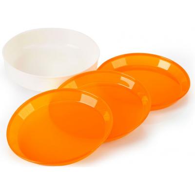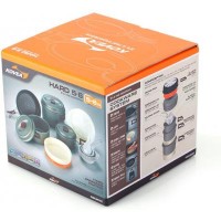 Набор состоит из трех кастрюлек объемом 2.6 литра, 1.8 литра и 1 литр, удобной сковороды, 3 тарелки, 5 чашек, судка, дуршлага, лопаточки и складного черпачка.
