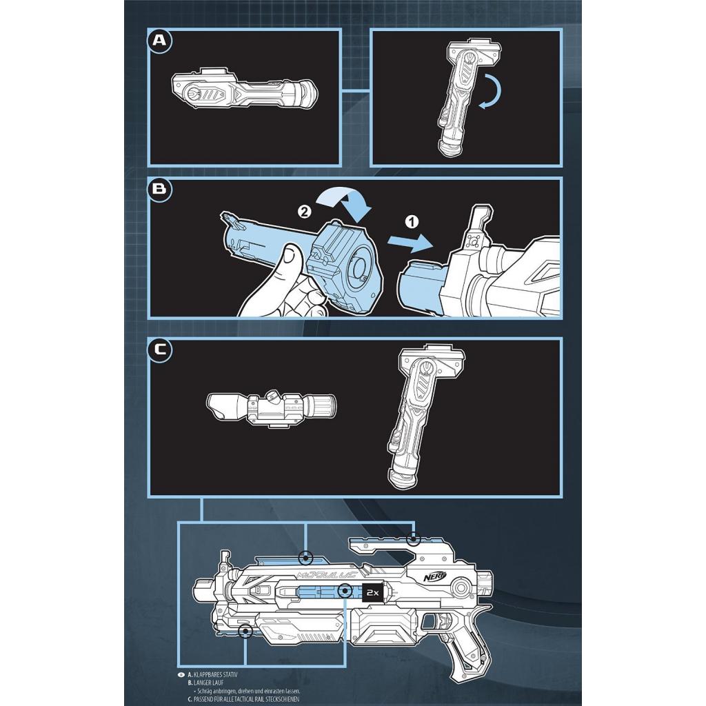 Используйте дополнительные модули в увлекательной игре и вы заметите, что ваш бластер может приобретать новые формы и возможности.В данный боевой набор входят оптический прицел для более точного наведения цели, раскладывающаяся подставка для точной стрельбы на дальние расстояния и насадка на ствол для повышения точности стрельбы на дальние расстояния.Материал:пластик.Тип боеприпасов: мягкие пули.