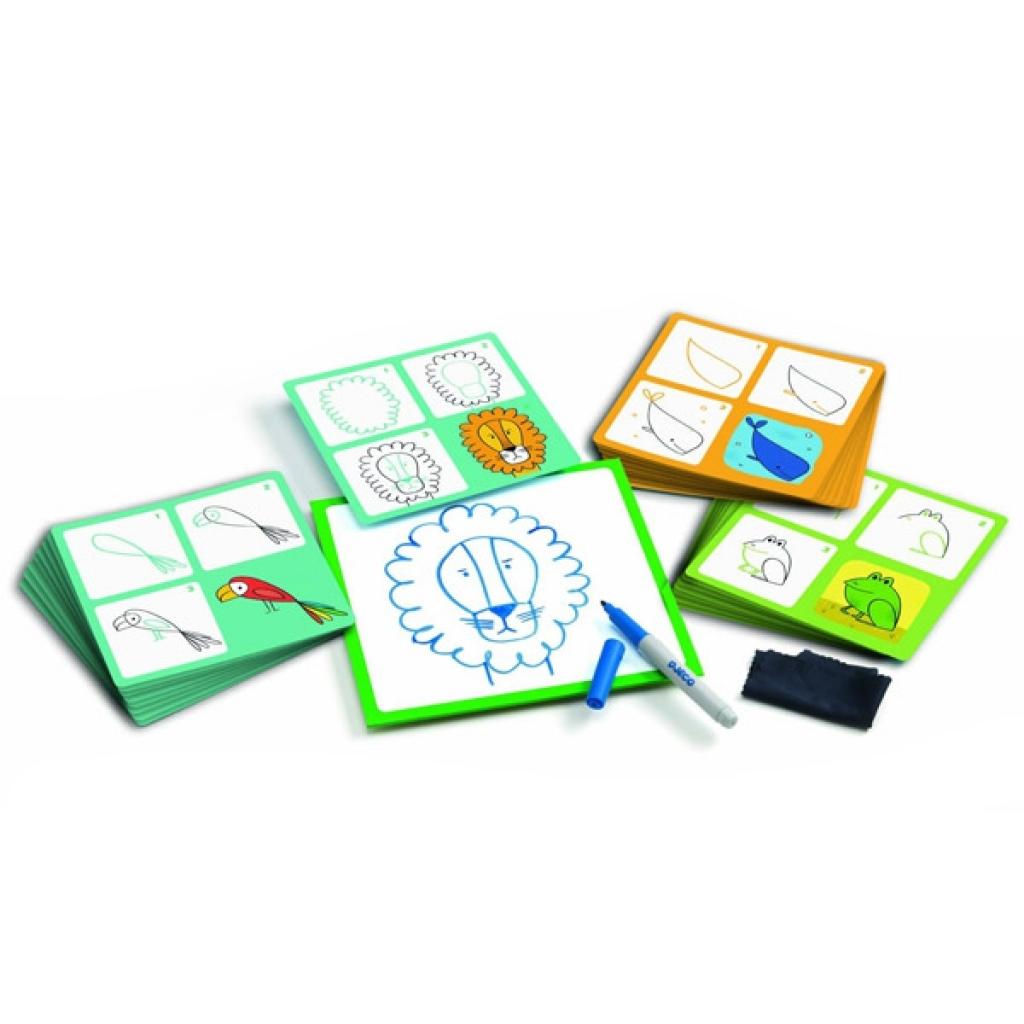 Игра Рисунок животные — настольная обучающая игра для юного художника от французкой фирмы Djeco.При помощи этой игры малыш шаг за шагом обучается рисованию. Нужно лишь следовать подсказкам на карточках.