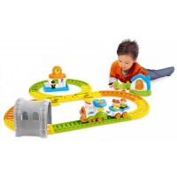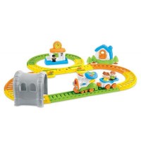 Паровоз может освещать себе дорогу прожектором, также подсвечивается дымовая труба.Чтобы поезд ехал по новой дороге на рельсах предусмотрены стрелки и малыш может сам выбирать направления для своих пассажиров.