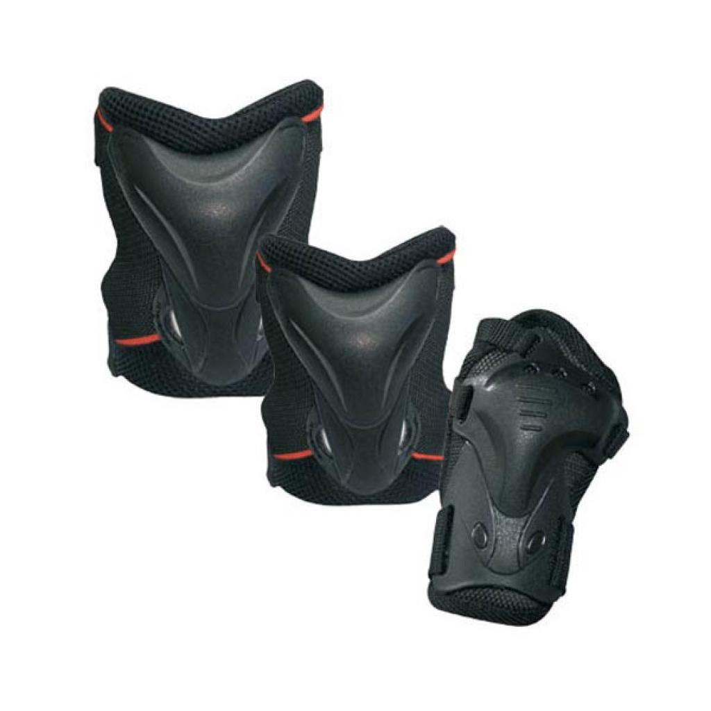 В комплект входят наколенники, налокотники и накладки на запястья.Конструкция элементов защиты имеет способность менять свою форму при движении суставов, благодаря чему обеспечивает естественность движения.