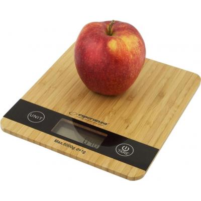 Компактные кухонные весы EKS005 от компании Esperanza с максимальной нагрузкой в 5 кг и шагом измерения 1 грамм, оснащены плоской платформой из дерева и позволяют проводить обнуление тары. В модели используется хорошо видимый цифровой дисплей.