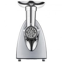 Также прибор имеет реверс, при помощи которого можно с легкостью очистить мясные жилы и прочие застрявшие в механизме при перемалывании продукты, при этом не разбирая прибор полностью.Комплектация включает следующие элементы: три диска разного диаметра для перемалывания разного типа фарша, насадка для приготовления колбасок, специальная насадка для томатов и других мягких овощей, толкатель, съемный шнек, встроенная ручка для удобной переноски.
