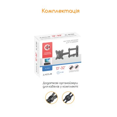 для монитора, для телевизора, Тип - поворотно-наклонный, количество степеней свободы - 3, минимальная поддерживаемая диагональ - 13", максимальная поддерживаемая диагональ - 32", VESA - 75 x 75, 100 x 100, Максимальная нагрузка - 20 кг, Наклон - 3° ~ -12°, Поворот - 90° ~ -90°, кронштейн для телевизора на стену, комплект крепления для монтажа, уровень, органайзеры для кабелей, инструкция, черный