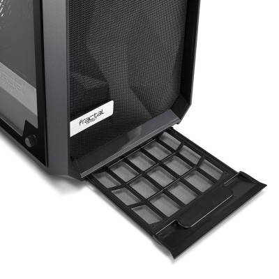 Угловатая асимметрия передней панели Meshify C – TG напоминает грани черного алмаза и, помимо эстетических функций, обеспечивает интенсивную вентиляцию.