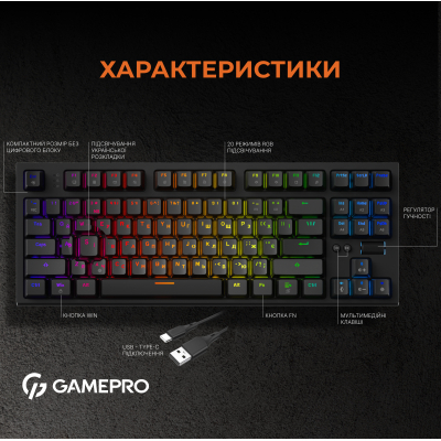 игровая, мультимедийная, с подсветкой, для ПК, механическая, проводная, USB, TKL, Подсветка - RGB, английская, украинская, Переключатели (Switches) - Outemu Red Hot-Swap, Клавиш - 87, съёмный кабель, программируемые клавиши, Шнур - 1.8 м, 365 х 138 х 40 мм, 800 г
