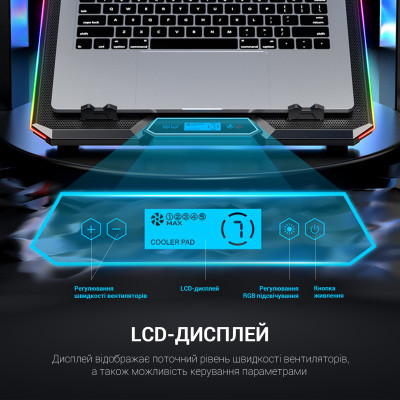 И еще одна приятная вещь - шесть уровней скорости вентиляторов, которые можно легко настраивать удобными кнопками.Если речь идет о подключении, то эта подставка обладает двумя USB-разъемами для дополнительных устройств.Еще один аспект - RGB-подсветка, которая создает невероятную атмосферу.