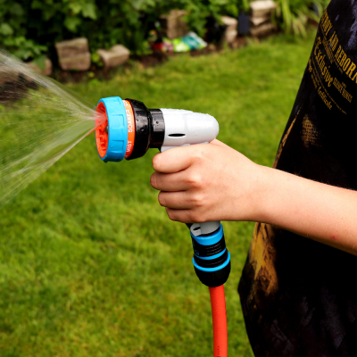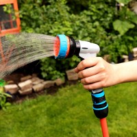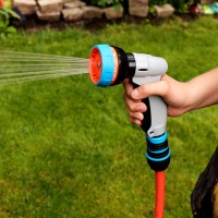 Пистолет для полива легко регулирует подачу воды с 7-ю типами струи: от точечной струи до большого распыления, что позволяет выполнять различные виды работ: от полива до уборки. Есть возможность зафиксировать кнопку включения, облегчает напряжение на руку в процессе полива.