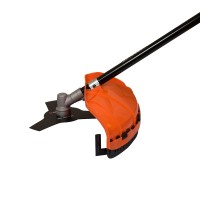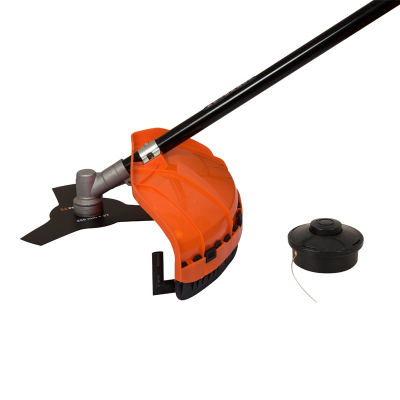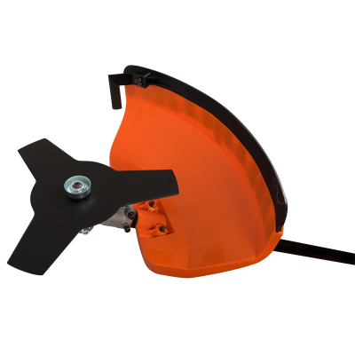 Такое конструктивное размещение двигателя позволяет безбоязненно работать с мокрой травой.Триммер комплектуется режущей катушкой с леской и трехлопастным ножом.Для предохранения пользователя от разлетающейся травы и твердых предметов при работе на нижней части штанги установлен защитный кожух.