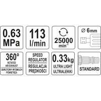 <span style="font-size: 1rem;">Прямая пневматическая шлифмашина <b style="font-size: 1rem;">YATO YT-09633<span style="font-size: 1rem;"> питается от струи сжатого воздуха под давлением. Предназначена для резки и шлифовки различных материалов с помощью соответствующих дисков.