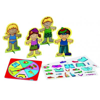 4 бумажные куклы, 2 листа с одеждой, подставка со стрелкой для выбора, правила игры