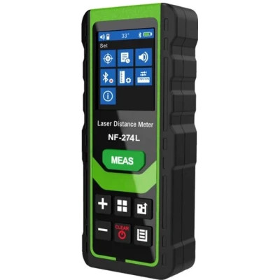 Noyafa NF-274L-80 - профессиональная лазерная рулетка (линейка) до 80 метров, производства компании Noyafa. Сердцем серии NF-274L яляется ультраяркий зелёный лазер обеспечивающий лучшие технические характеристики в сравнении с традиционными красными лазерами.Профессиональная лазерная линейка Noyafa NF274L-80 предназначена для измерения расстояний в диапазоне от 0.1 до 80 метров, углов наклона в диапазоне ± 90°, оснащена функциями вычитания и сложения, быстрого расчёта площадей (в том числе и треугольных) и объемов, всевозможных расчётов высот на основании теоремы Пифагора, и выполненных линейных и угловых измерений, к примеру: значений высоты на основании измеренного расстояния до основания и вершины, или расстоянию до вершины и углу между направлением до вершины и основанием .Особенностью лазерной рулетки NF-274L является не только мощный зелёный лазер обеспечивающий лучшую стабильность и надёжность измерений, но и расширенный функционал включающий цифровой уровень, голосовое озвучивание результатов, память на 99 измерений, Bluetooth-интерфейс.Сердцем серии NF-274L яляется ультраяркий зелёный лазер обеспечивающий лучшие технические характеристики в сравнении с традиционными красными лазерами.Профессиональная лазерная линейка Noyafa NF274L-80 предназначена для измерения расстояний в диапазоне от 0.1 до 80 метров, углов наклона в диапазоне ± 90°, оснащена функциями вычитания и сложения, быстрого расчёта площадей (в том числе и треугольных) и объемов, всевозможных расчётов высот на основании теоремы Пифагора, и выполненных линейных и угловых измерений, к примеру: значений высоты на основании измеренного расстояния до основания и вершины, или расстоянию до вершины и углу между направлением до вершины и основанием .Особенностью лазерной рулетки NF-274L является не только мощный зелёный лазер обеспечивающий лучшую стабильность и надёжность измерений, но и расширенный функционал включающий цифровой уровень, голосовое озвучивание результатов, память на 99 измерений, Bluetooth-интерфейс.