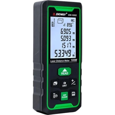 Зеленый лазер обеспечивает больную интенсивность излучения обеспечивая отличные результаты измерения при неблогоприятный условиях.Лазерная линейка Sndway SW-100G обеспечивает измерение расстояний в диапазоне от 0,05 до 100 метров, углов наклонаот -90° до +90°, и реализует функции вычитания и сложения, быстрого расчёта площади и объема, а так же косвенных измерений на основании теоремы Пифагора, к примеру: значений высоты на основании измеренного расстояния до основания и вершины и углов.