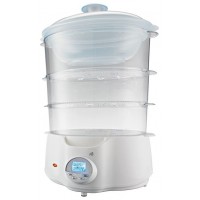 Пароварка имеет цифровой таймер, автоматическое отключение. Есть функция памяти, акустический сигнал, индикация уровня воды, индикатор образования накипи, LCD-дисплей. Имеются складные корзины. Мощность пароварки составляет 900 Вт.