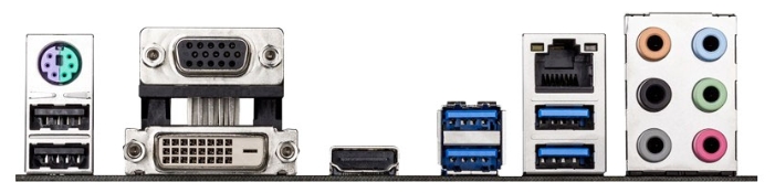 6 USB, из них 4 USB 3.0, D-Sub, DVI, HDMI, Ethernet, PS/2 (клавиатура), PS/2 (мышь)