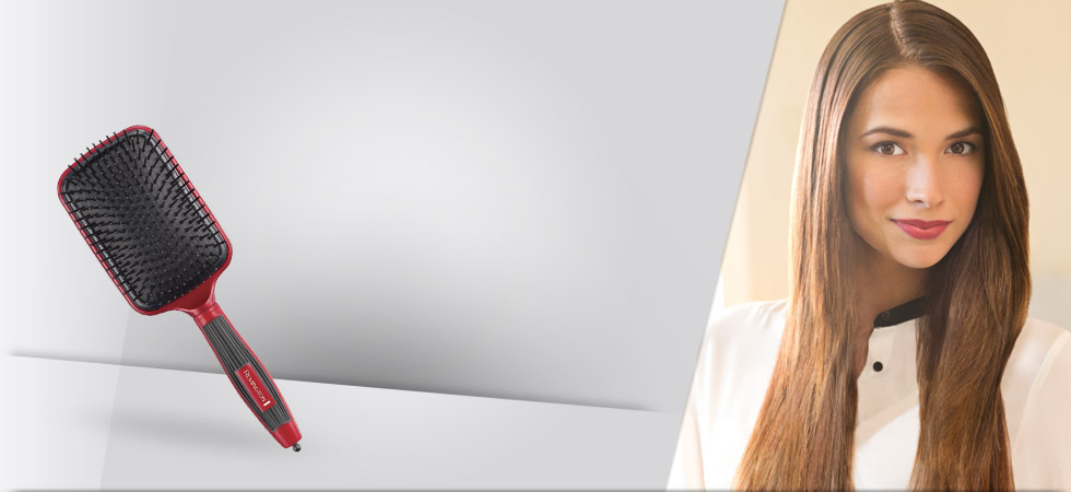 • Плоская щетка с нейлоновыми ионизирующими щетинками для создания прямых и гладких волос