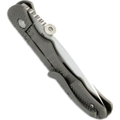 Рукоять анатомической формы сделана из легкого, но очень прочного титана шероховатой фактуры, и даже, несмотря на это, нож довольно увесистый и ощутимо лежит в руке.