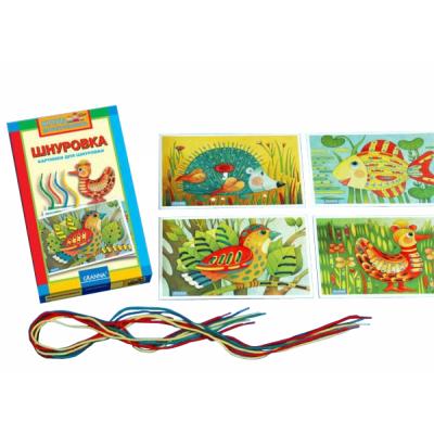 В развивающий набор входят восемь шнурков, четыре картинки и комплектная коробка.