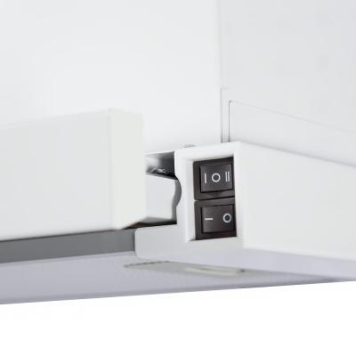 Вытяжка полностью встраивается в подвесной шкаф, видимой остается только ее фронтальная панель и кнопки управления.