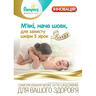 Новые Pampers Premium Care — подгузники, которые обеспечивают защиту кожи “5 звезд”, и дарят непревзойденную мягкость шелка.Это первые и единственные подгузники с впитывающими каналами, обеспечивающими до 12 часов сухости.• Мягкие, как шелк: Нежная ромбовидная текстура внутреннего слоя создает ощущение первоклассной мягкости и воздушности.• Впитывающие каналы: Уникальная технология впитывающего слоя – три впитывающих канала – помогают равномерно распределять влагу по поверхности подгузника, обеспечивая сухость до 12 часов.• “Дышащие” материалы: Благодаря особым микропорам внешний слой Pampers Premium Care обеспечивает естественную циркуляцию воздуха, снижая уровень испарений внутри подгузника, и, как следствие, уменьшая риск возникновения дерматита.• Индикатор влаги: Специальная полоска, которая меняет желтый цвет на синий, подсказывает, когда нужно сменить подгузник.• Тянущиеся боковинки: эластичные тянущиеся боковинки для максимального комфорта и защиты от протекания.
