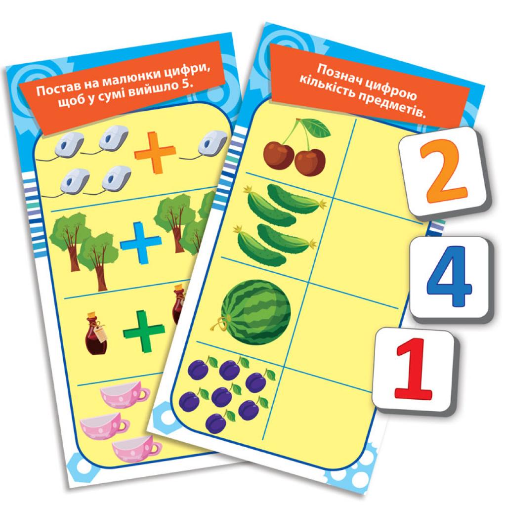 В каждой коробке – 48 мягких магнитов — это цифры, математические знаки и магнитные картинки для счетного материала.