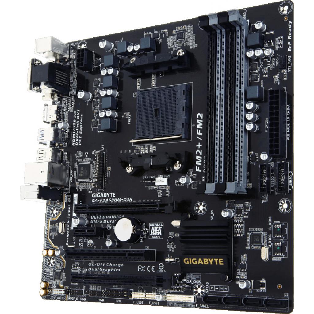Материнская плата GIGABYTE GA-F2A68HM-D3Hоборудована новым процессорным разъёмом FM2+ и разработана для получения максимальной отдачи от новейших APU AMD Kaveri, сохраняя совместимость с APU в исполнении AMD FM2*. FM2+ AMD APU обладают врождённой поддержкой интерфейса PCI-E 3-го поколения с пропускной способностью 8 Гбит/с а также поддержкой DX11.1 и высокопроизводительными вычислительными ядрами Steamroller.Обеспечивая чипсетом AMD A68H врождённую поддержку портов USB3.0 и SATA3 с пропускной способностью до 5 и 6 Гбит/с соответственно, платы GIGABYTE серии FM2+ отличаются повышенной стабильностью и эффективностью за счёт уникальной технологии Gigabyte Ultra Durable.Эксклюзивный дизайн встроенной аудиоподсистемыLED-трассировка зоны аудиоподсистемы, чтобы подчеркнуть индивидуальность вашего ПК.Защита от влажностиПрогрессивная технология производства печатных плат предусматривает применение в качестве основы принципиально нового стекловолокна, у которого расстояние между волокнами сокращено, а узлы переплетения более плотные.FM2+ AMD APU обладают врождённой поддержкой интерфейса PCI-E 3-го поколения с пропускной способностью 8 Гбит/с а также поддержкой DX11.1 и высокопроизводительными вычислительными ядрами Steamroller.Обеспечивая чипсетом AMD A68H врождённую поддержку портов USB3.0 и SATA3 с пропускной способностью до 5 и 6 Гбит/с соответственно, платы GIGABYTE серии FM2+ отличаются повышенной стабильностью и эффективностью за счёт уникальной технологии Gigabyte Ultra Durable.Эксклюзивный дизайн встроенной аудиоподсистемыLED-трассировка зоны аудиоподсистемы, чтобы подчеркнуть индивидуальность вашего ПК.Защита от влажностиПрогрессивная технология производства печатных плат предусматривает применение в качестве основы принципиально нового стекловолокна, у которого расстояние между волокнами сокращено, а узлы переплетения более плотные.