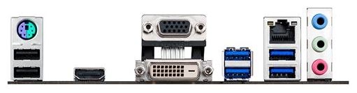 6 USB, из них 4 USB 3.0, D-Sub, DVI, HDMI, Ethernet, PS/2 (клавиатура), PS/2 (мышь)