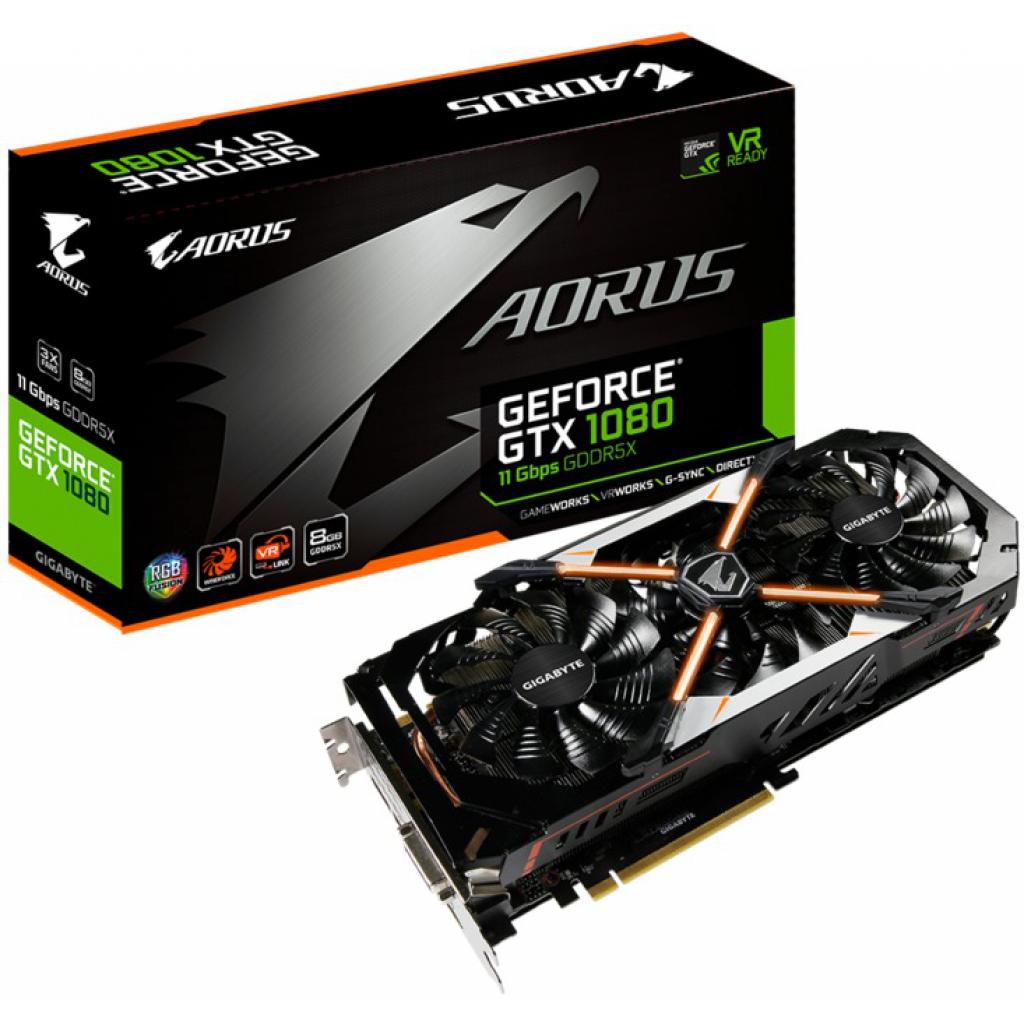 Видеокарта GIGABYTE GeForce GTX1080 8Gb AORUS 11Gbps (GV-N1080AORUS-8GD) GDDR5X, 256 Bit, 1733 MHz, 11010 MHz, 3 x DisplayPort, DVI, HDMI, кулер, радиатор, 8 + 8 pin