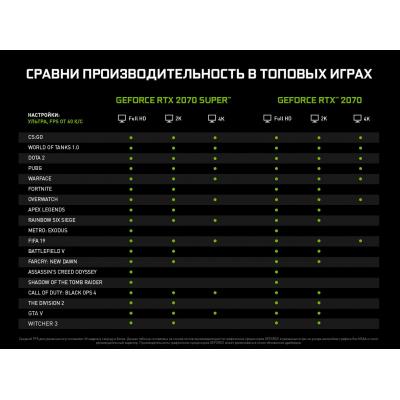 Семейство графики - NVIDIA, Графический чип - GeForce RTX 2070, интерфейс - PCI-Express x16 3.0, объем встроенной памяти - 8 ГБ, тип памяти - GDDR 6, разрядность шины памяти - 256 Bit, разъемы - 2 х HDMI, 2 x DisplayPort, USB Type-C, тип системы охлаждения - активный, вид охлаждения - кулер, радиатор, разъемы дополнительного питания - 6+8 pin