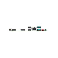 Слотов расширения нет.На задней панели расположились: четыре USB порта, среди которых два высокоскоростных, один сетевой разъем RJ-45, два аудиоразъема, выдеовыходы и коннектор питания.Особое внимания в платах коммерческой серии уделяется повышенной безопасности, надежности и управляемости.