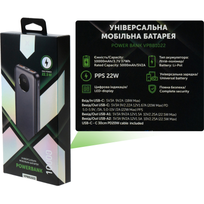 Батарея универсальная Vinga 10000 mAh 22.5W Display Black (VPBB1022) — это отличное решение для тех, кто ищет надежную и функциональную портативную зарядную станцию. Благодаря большой емкости 10000 mAh, это устройство способно обеспечить вашим гаджетам длительную автономию, будь то телефон, плеер, роутер, планшет или смарт-часы.Одной из ключевых особенностей этой модели является использование электрохимической системы Li-pol, которая отличается долговечностью и стабильностью в работе.