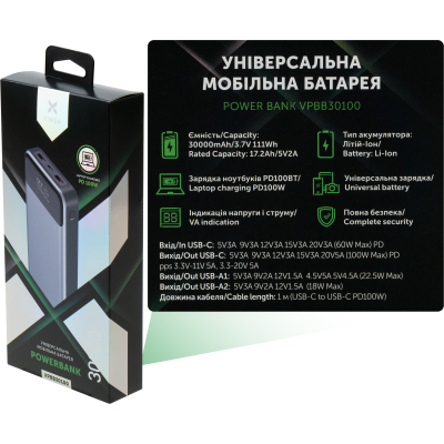 Откройте для себя универсальный аккумулятор Vinga 30000 mAh 100W Display VA Grey, который станет идеальным спутником для любого цифрового устройства. С огромной ёмкостью 30000 mAh, это внешнее устройство обеспечит вам долгую работу вашего смартфона, планшета, ноутбука или других девайсов, куда бы вы ни отправились.Электрохимическая система Li-Ion гарантирует эффективность и надёжность работы, а также долгий срок службы батареи.